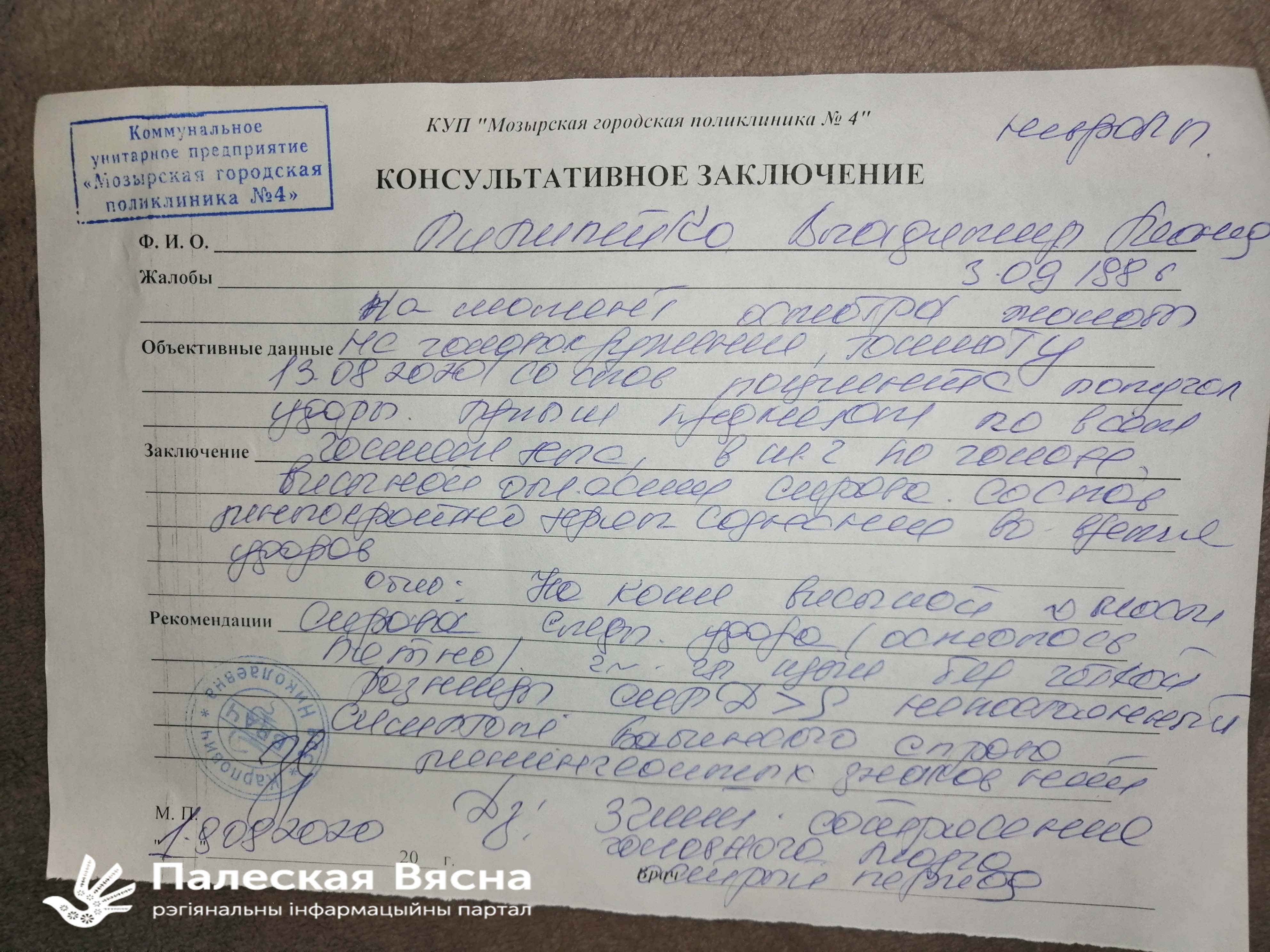 «Калі я быў у ІЧУ, мяне вазілі на асведчанне да доктара ў лякарню. Там я нічога не казаў пра збіццё, бо баяўся – потым трэба было зноў вяртацца ў міліцыю. Але пазней да мяне ў ІЧУ прыходзіў следчы, апытваў наконт збіцця. Я распавёў яму як было. Цяпер ён мне тэлефануе, просіць прыехаць у Мазыр, каб зноў даць нейкія паказанні. Але я баюся. Ходзяць размовы, што тых, хто зноў трапляе ў гэтыя ўстановы, па-новай затрымліваюць і выпраўляюць у міліцыю. А што там будзе адбывацца – можна толькі здагадвацца. Яны пастараюцца зрабіць усё, каб схаваць свае злачынствы і каб пра іх не стала вядома», – лічыць Уладзімір Піліпейка.