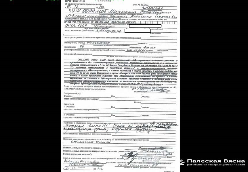 Пры гэтым Канопліч надрукаваў (магчыма, скапіяваўшы аднекуль) у пратаколе, дзе ўсё астатняе напісана ад рукі, што «20.12.2010 около 14.10 часов Петровский А.В. принимал активное участие в проводившемся без соответствующего разрешения Мозырского райисполкома и в нарушении порядка установленного ч. 1 ст. 10 Закона Республики Беларусь от 30 декабря 1997 года № 114-З “О массовых мероприятиях в Республике Беларусь” в несанкционированном массовом мероприятии – “Пикетирование”, а именно находился в «парке культуры и отдыха Победа» от дома 81 до 35 по улице Советской в городе Мозыре в ходе чего держал флаг бело-красно-белого цвета, с целью публичного выражая свое общественно политическое настроение, а именно выражение не согласия с действующей властью, действуя повторно в течении года после наложения административного взыскания за аналогичное правонарушение от 30.10.2020, чем совершил правонарушение предусмотренное ч. 3 ст. 23.34 КоАП Республики Беларусь» (мова, арфаграфія, стылістыка і пунктуацыя старшага лейтэнанта Аляксандра Канопліча захаваныя, бо яны дужа адметныя і надта яскрава ілюструюць адукацыйны ўзровень супрацоўнікаў, якія дагэтуль застаюцца працаваць у органах унутраных справаў Беларусі).
