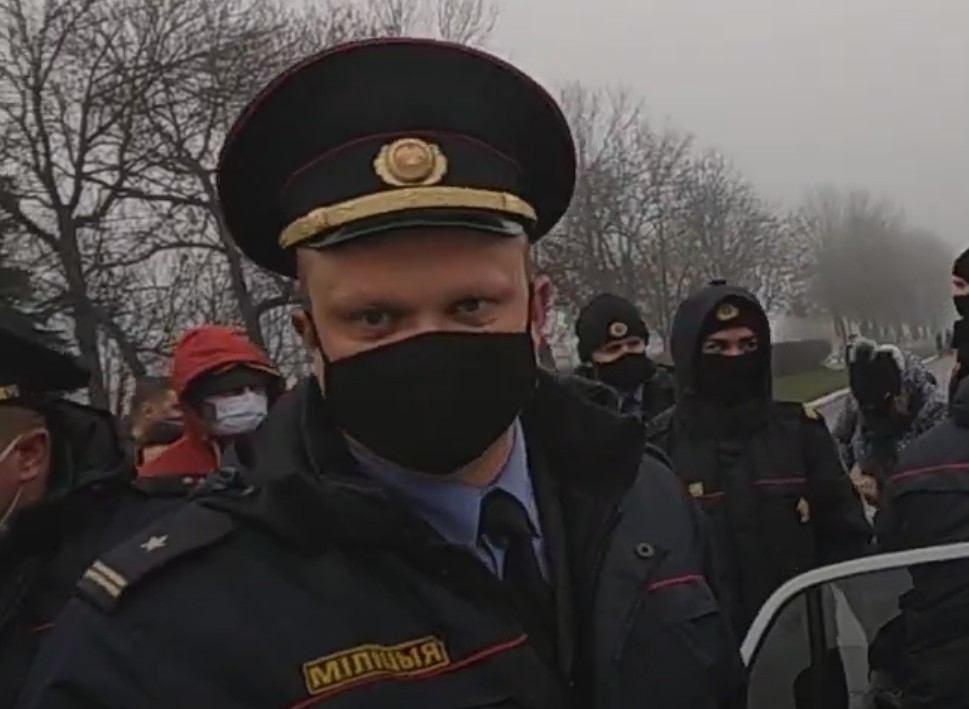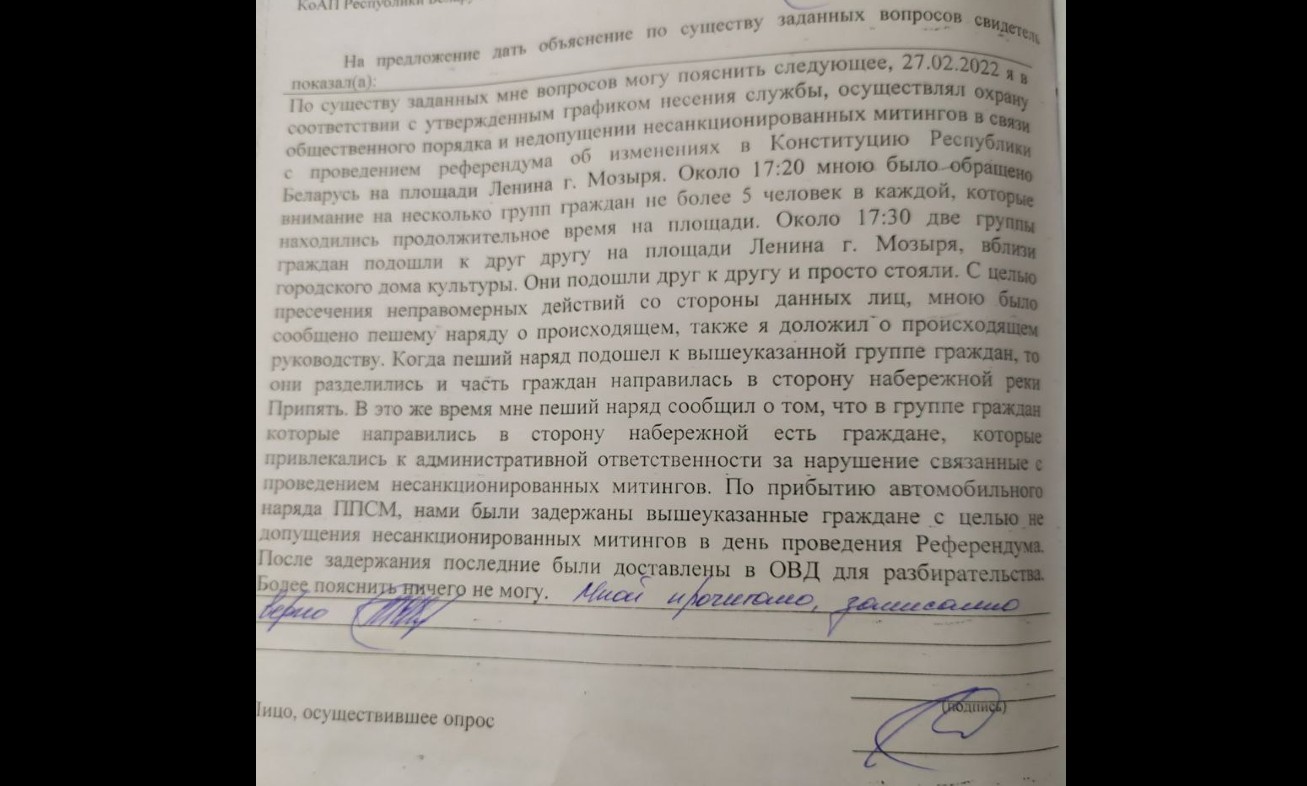 «Около 17.20 мною было обращено внимание на несколько групп граждан не более 5 человек в каждой, которые находились продолжительное время на площади. Около 17.30 две группы граждан подошли друг к другу на площади Ленина г. Мозыря, вблизи городского дома культуры. Они подошли друг к другу и просто стояли. С целью пресечения неправомерных действий со стороны данных лиц, мною было сообщено пешему наряду о происходящем, также я доложил о происходящем руководству».