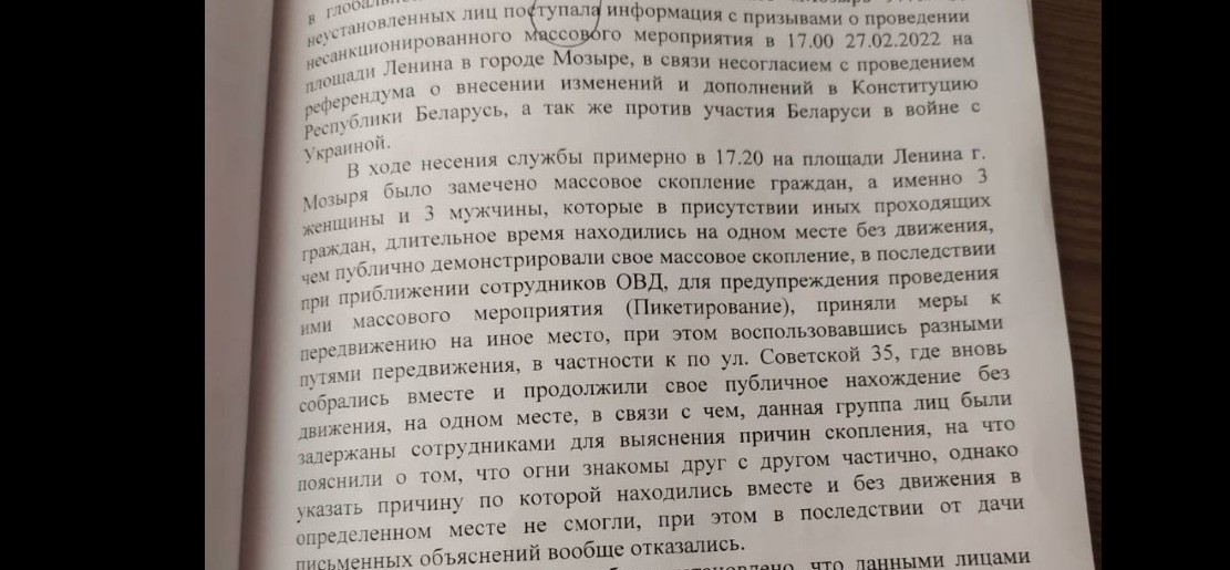 “В ходе несения службы, примерно в 17.20 на площади Ленина г. Мозыря было замечено массовое скопление граждан, а именно 3 женщины и 3 мужчины, которые в присутствии иных проходящих граждан, длительное время находились на одном месте без движения, чем публично демонстрировали свое массовое скопление, в последствии при приближении сотрудников ОВД, для предупреждения проведения ими массового мероприятия (Пикетирование), приняли меры к передвижению в иное место, при этом воспользовавшись разными путями передвижения, в частности к по ул. Советской, 35, где вновь собрались вместе и продолжили свое публичное нахождение без движения на одном месте, в связи с чем данная группа граждан были задержаны сотрудниками».
