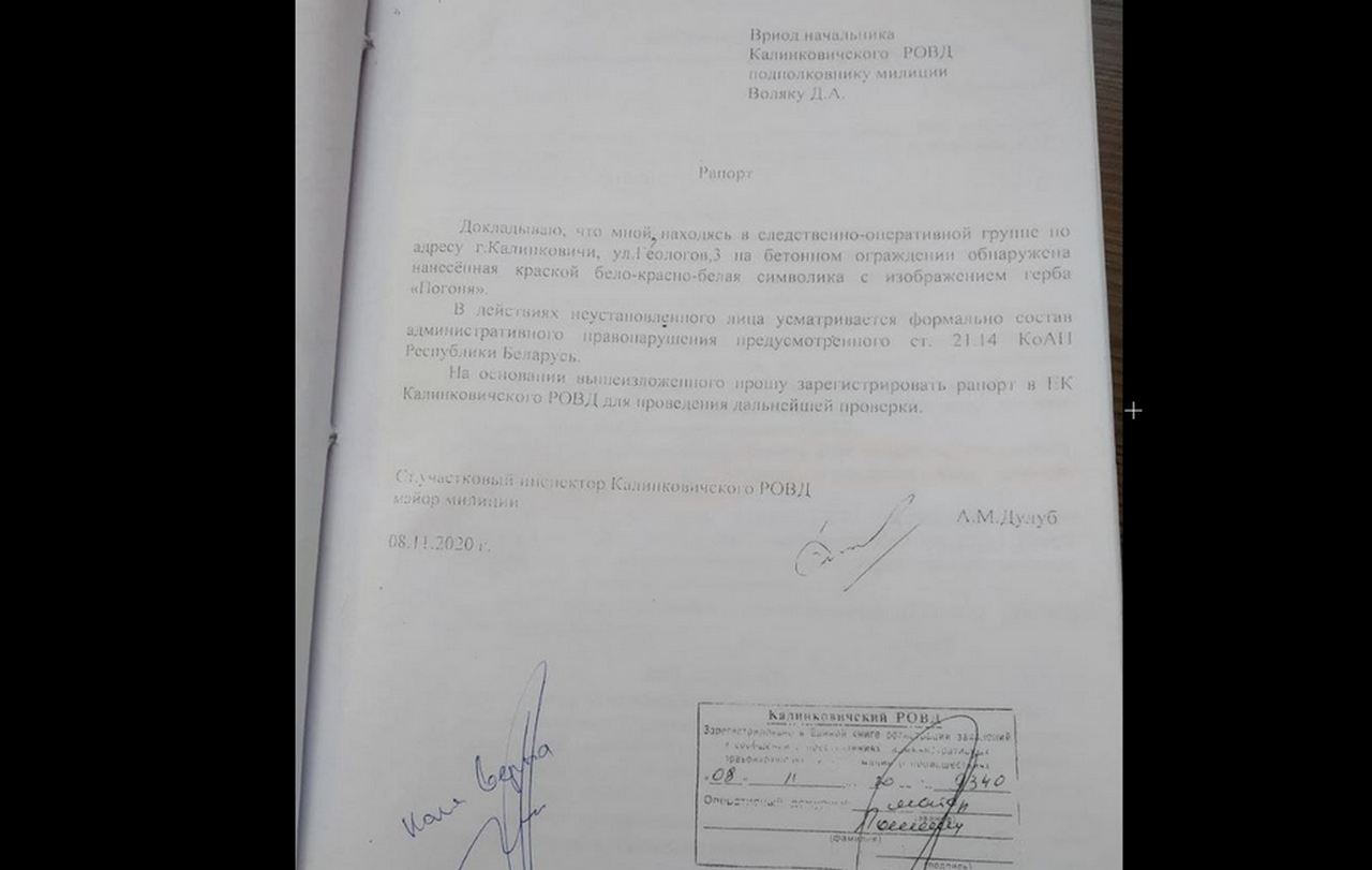 2020 года, у якім ён паведаміў начальніку Калінкавіцкага РАУС, што ён выявіў на
