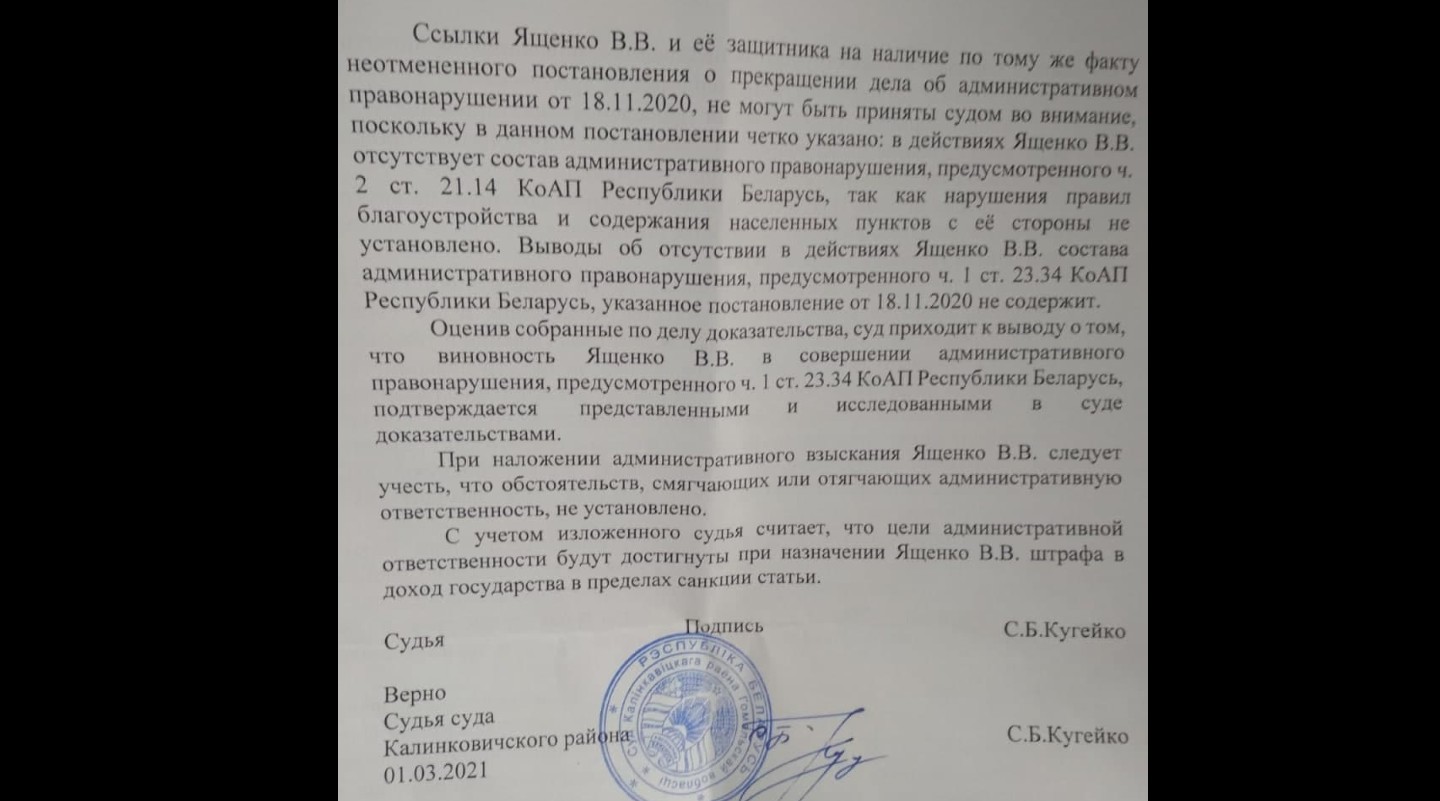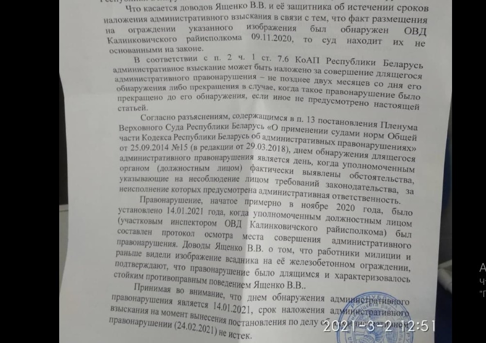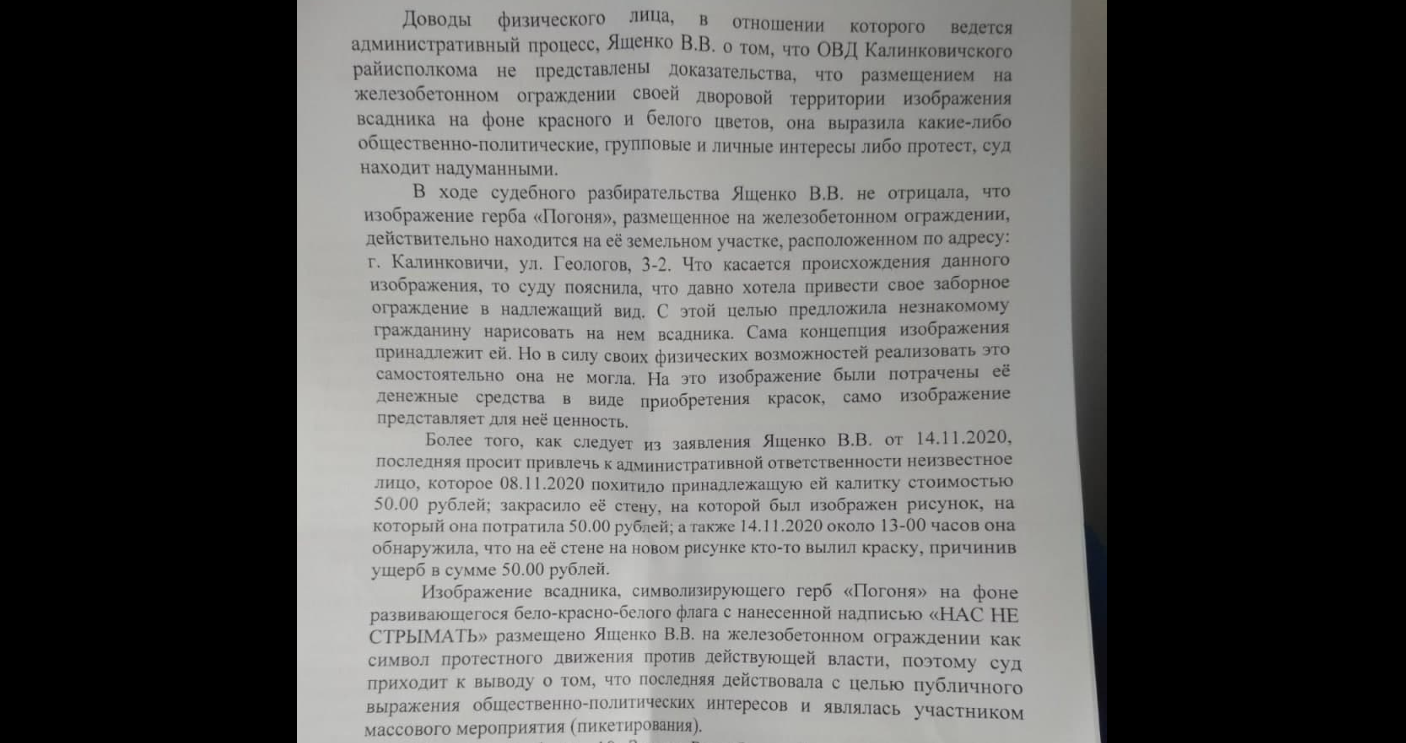 Суддзя суда Калінкавіцкага раёна Святлана Кугейка прыдумала, як абгрунтаваць сваё рашэнне аб штрафе мясцовай жыхарцы Валянціне Яшчанка за размешчаны ўнутры яе двара малюнак вершніка на фоне белага і чырвонага колераў.