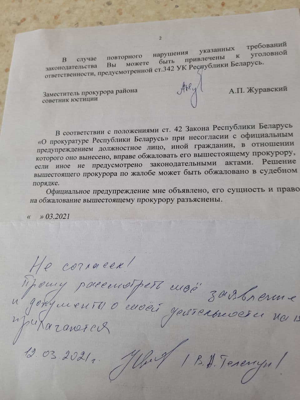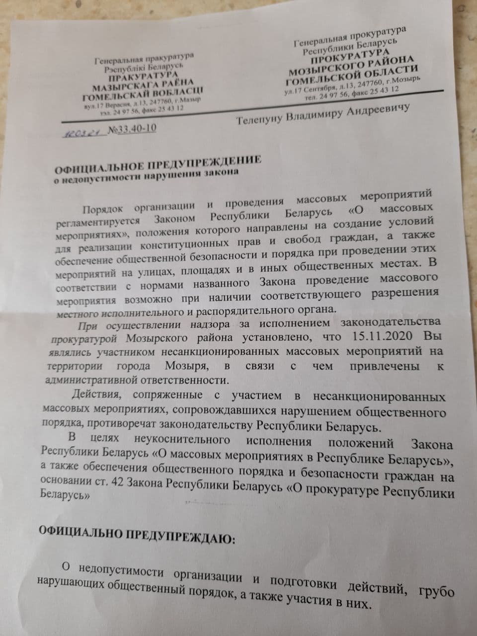 Пра свой візіт на выклік у пракуратуру Мазырскага раёна распавёў кіраўнік мясцовай філіі Праваабарончага цэнтру «Вясна» Уладзімір Целяпун. Ён накіраваў туды заяву аб парушэннях заканадаўства з боку супрацоўнікаў сілавых структуры Мазыра падчас мірных сходаў паводле вынікаў свайго назірання за іх правядзеннем. Але намеснік пракурора Мазырскага раёна Аляксандр Жураўскі даў Целепуну падпісаць папярэджанне, дзе сказана, што пры паўторным парушэнні закона пра масавыя мерапрыемствы праваабаронцу могуць пакараць паводле крымінальнага артыкула. Целяпун з папярэджаннем не пагадзіўся, пра што напісаў проста на ім.