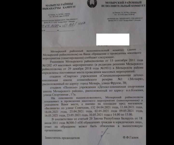 Але Мазырскі райвыканкам у асобе намесніка ягонага старшыні Фелікса Галюка чакана адмовіў у заяўцы на ўсе даты. Пры гэтым нейкіх прымальных абгрунтаванняў не прывёў. Спаслаўся на сваё рашэнне ад 2011 года, якім ён вызначаў месцы для правядзення масавых мерапрыемстваў у паведамляльным парадку. Іх на ўвесь Мазырскі раён вызначана аж два. І абодва – на стадыёнах: у самім Мазыры гэта стары стадыён «Спартак» і ў прыгараднай вёсцы Козенкі таксама тамтэйшы стадыён. Праўда месцы гэтыя схаваныя ад людскіх плыняў і наўрад ці нейкія меркаванні, якія там выказваліся б, нехта пачуў.