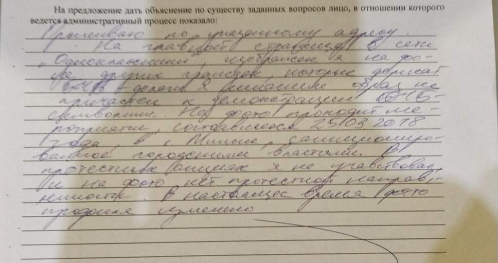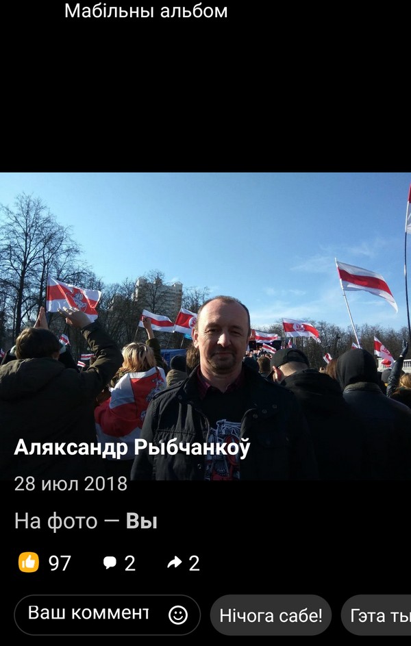 «Для мяне стаўся нечаканасцю візіт міліцыянта, бо я не ўдзельнічаў у акцыях пратэсту. І гэтае фота я размясціў яшчэ ў 2018-м годзе, а не 26 красавіка 2021, як напісаў міліцыянт у пратаколе. Дату размяшчэння добра бачна пад фота ў сацсетцы. Тым не менш, аказваецца цяпер нават запіс трохгадовай даўніны на сваёй уласнай старонцы ў сацсетцы, дзе маецца фота, на якое трапілі бел-чырвона-белыя сцягі, улады лічаць несанкцыянаваным масавым мерапрыемствам. Мне цяжка ўявіць да якога яшчэ маразму могуць такім чынам дадумацца тыя, хто паўсюль шукае ворагаў», – адрэагаваў на сітуацыю Аляксандр Рыбчанкоў.