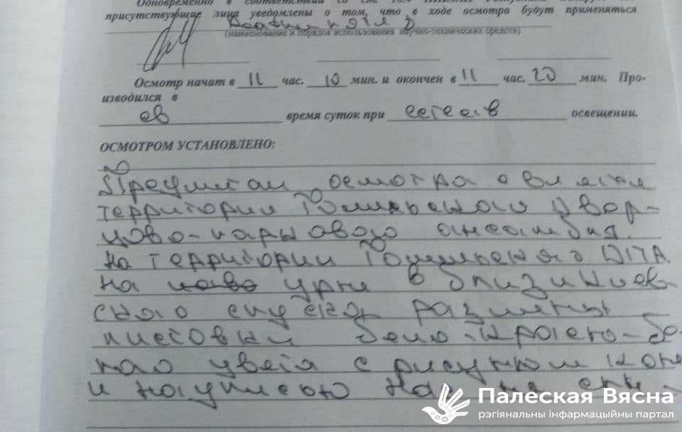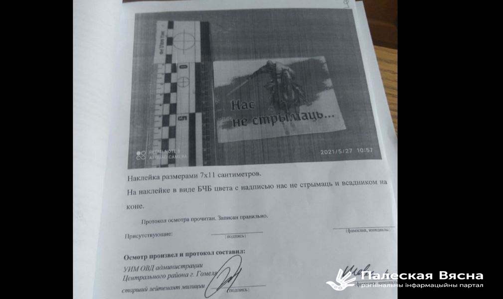 Яго завезлі ў Цэнтральны РАУС Гомеля. Там правялі асабісты вобшук. У кішэні курткі, якая была апранутая паверх майкі з гербам Рэчыцы, знайшлі 21 налепку з выявай вершніка з апушчаным долу мячом на фоне белага і чырвонага колераў. Раптам высветлілася, што ў парку расклееныя такія налепкі. Участковы інспектар капітан Арцём Жаўняк ад 11.10 да 11.20 правёў агляд «участка мясцовасці ў парку імя Луначарскага». Там на нейкім прадмеце, паблізу ад Кіеўскага спуска, які ён спачатку ў пратаколе хацеў назваць неяк інакш, але гэтыя літары закрэсліў, і напісаў, што «на урне» (на сметніцы), ён убачыў «листовки бело-красно-белого цвета с рисунком коня и надписью нас не спынить». Колькі тых «листовок» ён убачыў на той «урне», капітан у пратаколе не ўказаў.