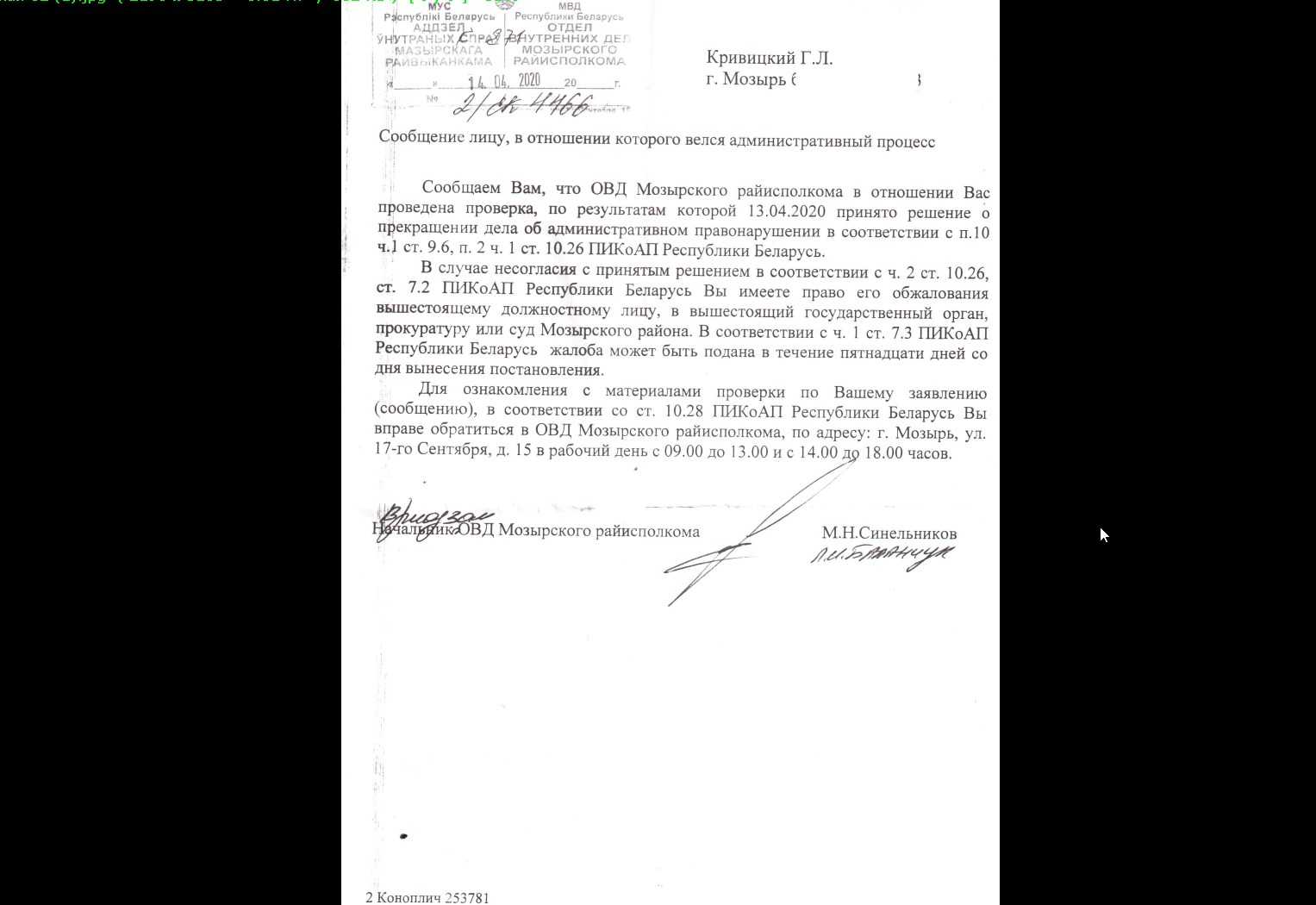 Кіраўнік аддзялення Руху За Свабоду ў Мазыры Рыгор Крывіцкі атрымаў паведамленне з Мазырскага РАУС пра тое, што адміністрацыйны працэс у дачыненні да яго спынены паводле пункта 10 часткі 1 артыкула 9.6 і п. 2 часткі 1 артыкула 10.26 Працэсуальна-выканаўчага Кодэкса аб адміністрацыйных правапарушэннях. Гэтыя пункты акрэсліваюць падставу спынення адміністрацыйнага працэсу ў сувязі з недаказанасцю віны фізічнай асобы, у дачыненні да якой вядзецца адміністрацыйны працэс.
