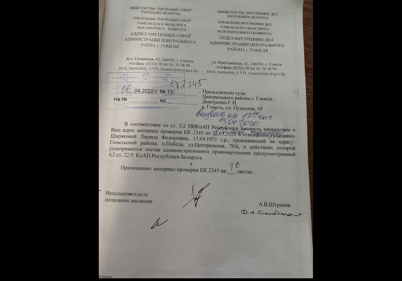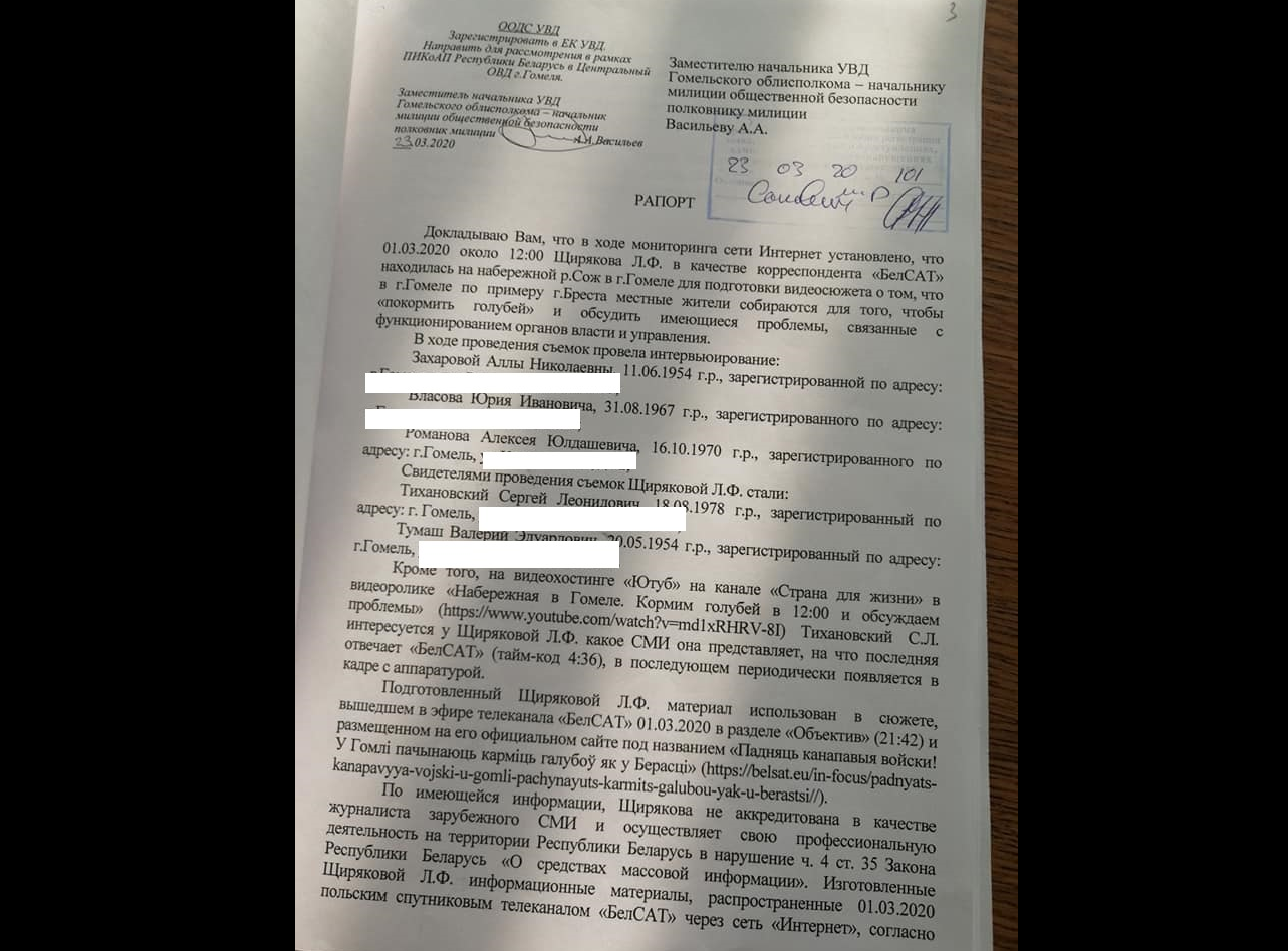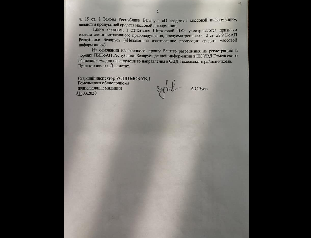На журналістку-фрылансерку Ларысу Шчыракову з Гомеля 1 красавіка склаў пратакол аб адміністрацыйным правапарушэнні старшы ўчастковы інспектар міліцыі Цэнтральнага РАУС Гомеля Пётр Грамадцоў. Ён напісаў, што «01.03.2020 каля 12.00 гадзін Шчыракова Л.Ф. знаходзячыся на набярэжнай р. Сож у г. Гомелі ў парушэнне п.п. 3, 4 арт. 35 Закона РБ “Аб сродках масавай інфармацыі”, фактычна выконваючы, у адпаведнасці з п. 6 арт. 1 Закона функцыі журналіста замежнага СМІ без акрэдытацыі ў МЗС РБ, злоўжываючы правамі і ў парушэнне абавязкаў журналіста, прадугледжанымі п.п. 2.4.6 арт. 34 Закона, падрыхтавала відэасюжэт і распаўсюдзіла яго польскім спадарожнікавым тэлеканалам “БелСАТ” праз сетку “Інтернет” у раздзеле “Аб’ектыў” 01.03.2020 г.» (захаваная пунктуацыя аўтара).