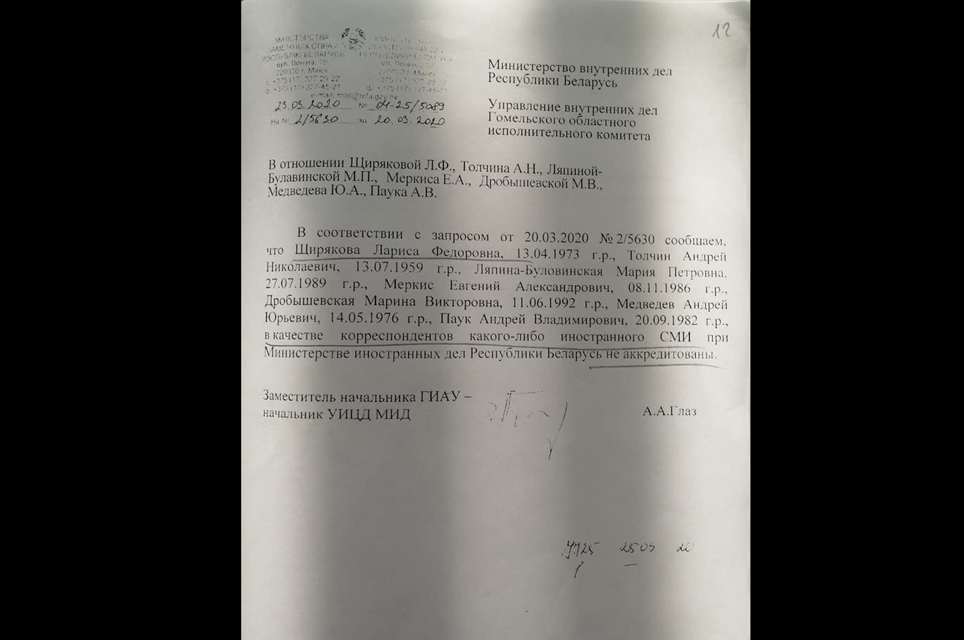 У матэрыялах адміністрацыйнай справы ў дачыненні да Ларысы Шчыраковай маецца таксама адказ з Міністэрства замежных справаў на запыт УУС Гомельскага аблвыканкама пра тое, ці маюць гомельскія журналісты акрэдытацыю пры МЗС. Запыт тычыўся адразу сямі журналістаў-фрылансераў і блогераў з Гомеля і Гомельскай вобласці – Ларысы Шчыраковай, Андрэя Толчына, Марыі Булавінскай, Яўгена Меркіса, Марыны Драбышэўскай, Андрэя Мядзведзева і Андрэя Павука. Відавочна, што ўлады баяцца распаўсюду непадкантрольнай дзяржаўнай цэнзуры інфармацыі і шукаюць спосабы прымусіць змоўкнуць усіх незалежных журналістаў Гомельшчыны.