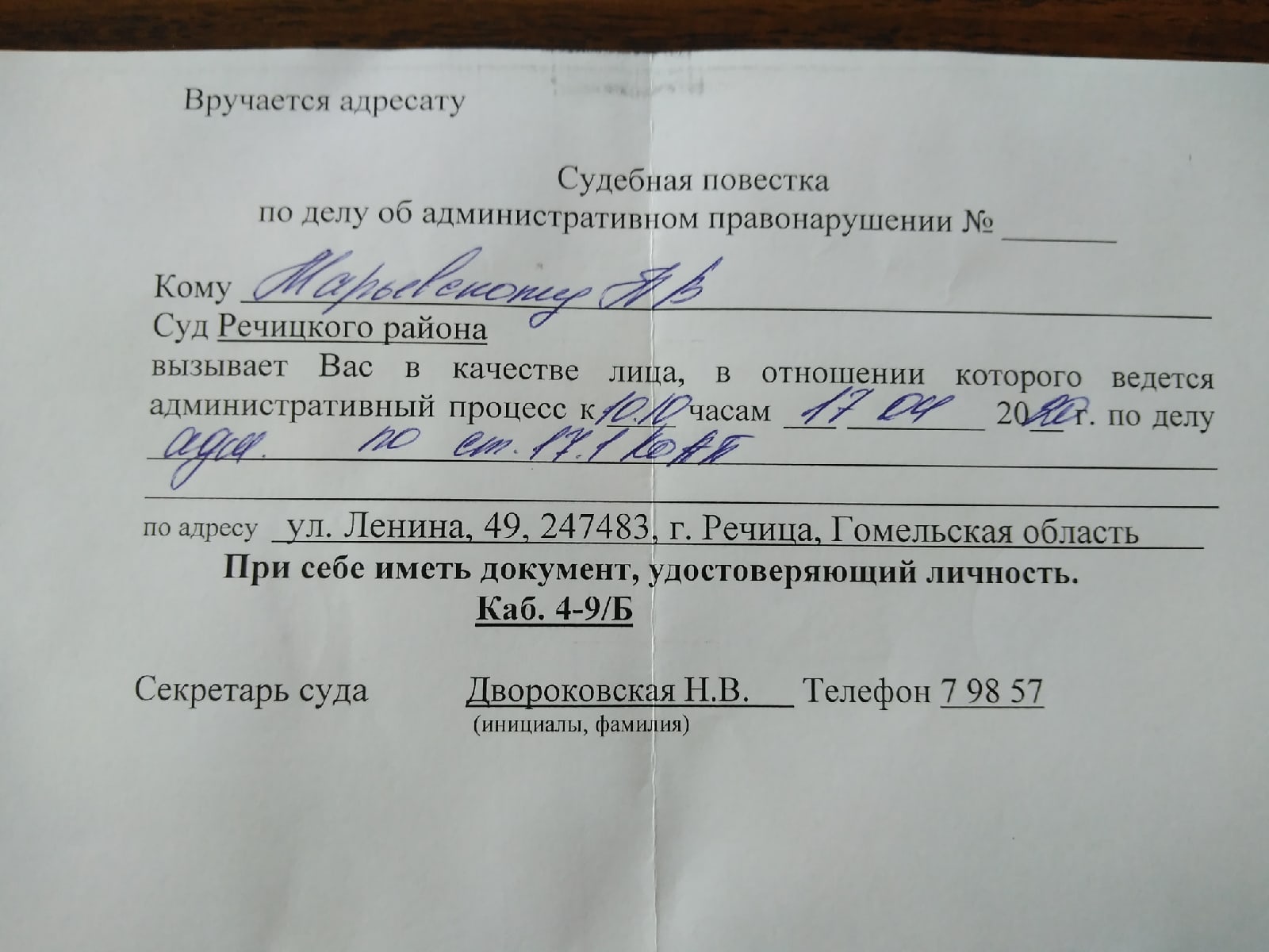 Павел Мар’еўскі, які здымаў на відэа блакаванне пацыентаў раённай паліклінікі ў Рэчыцы, 10 красавіка атрымаў позву ў суд у якасці асобы, у дачыненні да якой вядзецца адміністрацыйны працэс паводле артыкула 17.1 КабАП, на 17 красавіка.