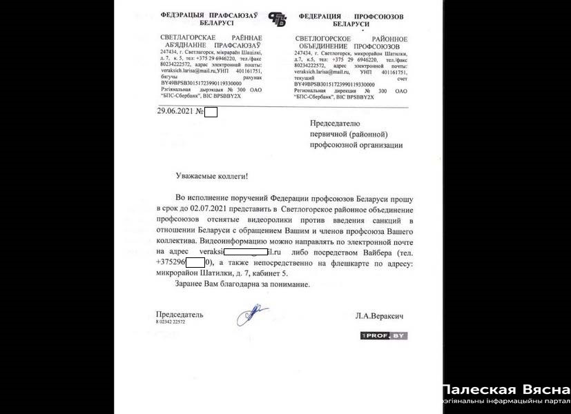 Светлагорскага раёну тамтэйшае аб’яднанне прафсаюзаў. Прычым, лісты ідуць як ў