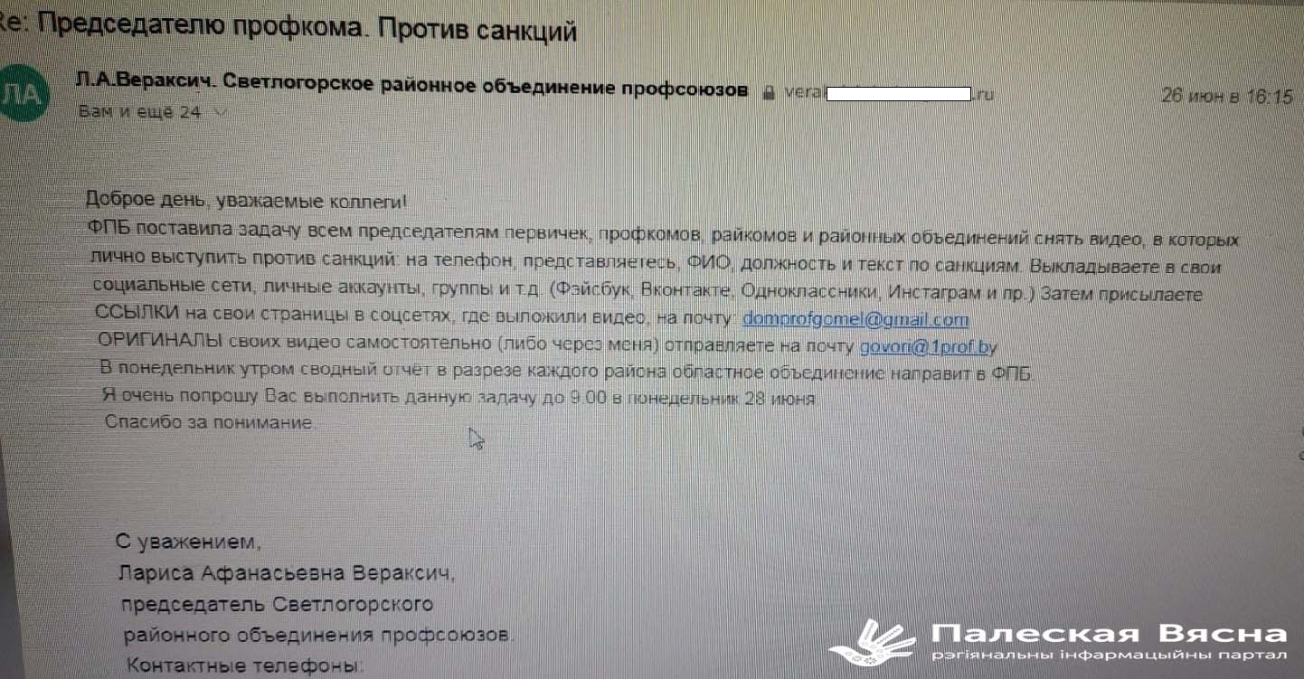 «ФПБ паставіла задачу ўсім старшыням пярвічак, прафкамаў, райкамаў і раённых аб’яднанняў зняць відэа, у якіх асабіста выступіць супраць санкцыяў: на тэлефон, прадстаўляецеся, “ФИО”, пасада і тэкст па санкцыях. Выкладаеце ў свае сацыяльныя сеткі, асабістыя акаунты, групы і г.д. (Фэйсбук, УКантакце, Аднакласнікі, Інстаграм і інш.) Затым дасылаеце спасылкі на свае старонкі, дзе выклалі відэа, на пошту (даецца e-mail Гомельскага абласнога аб’яднання прафсаюзаў). Арыгіналы сваіх відэа самастойна (або праз мяне) адпраўляеце на пошту (даецца e-mail, звязаны з сайтам Федэрацыі прафсаюзаў)».