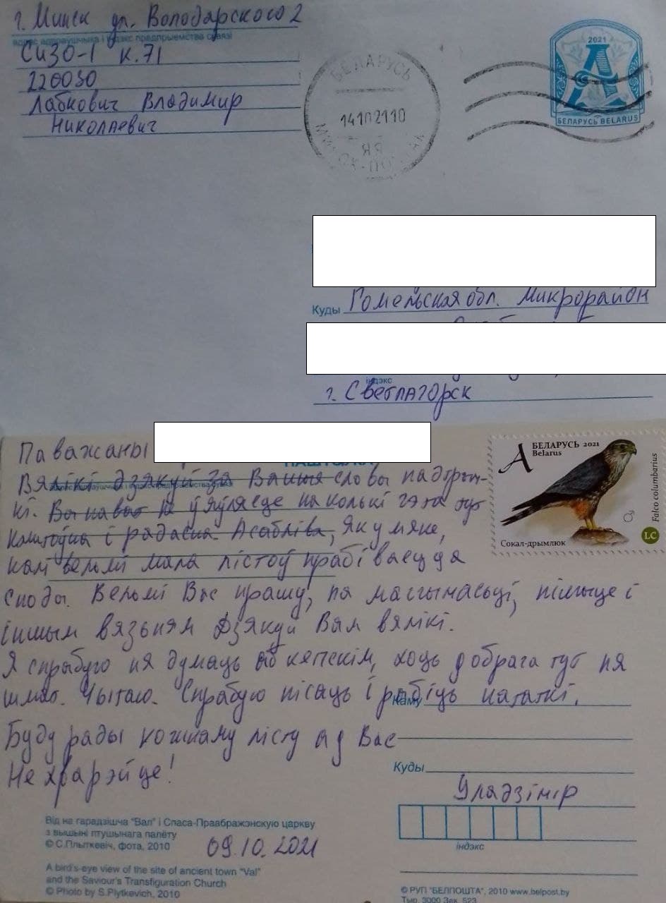 Адзін з тых, хто пісаў палітвязню, юрысту Праваабрончага цэнтру «Вясна» Уладзіміру Лабковічу, днямі атрымаў адказ ад Уладзіміра, які той напісаў яшчэ 9 кастрычніка. У невялікай паштоўцы палітвязень дзякуе за словы падтрымкі.