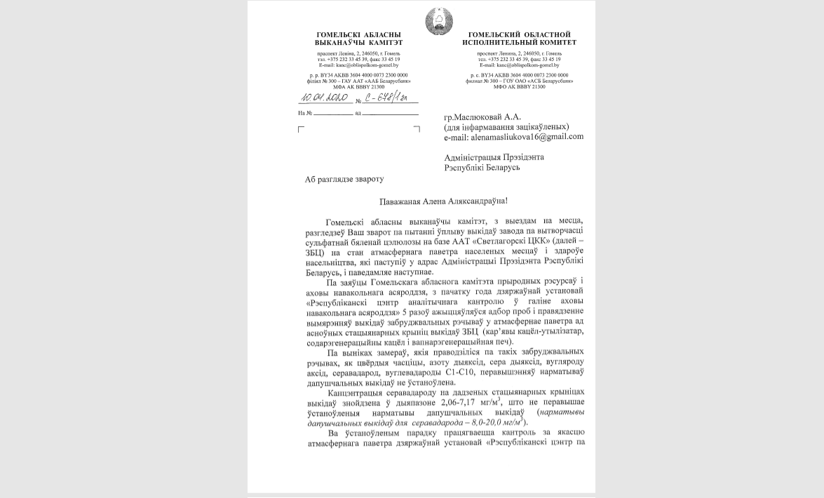 светлагорцаў і слабадцоў у Гомельскі аблвыканкам. Адтуль напісалі адказ ажно на