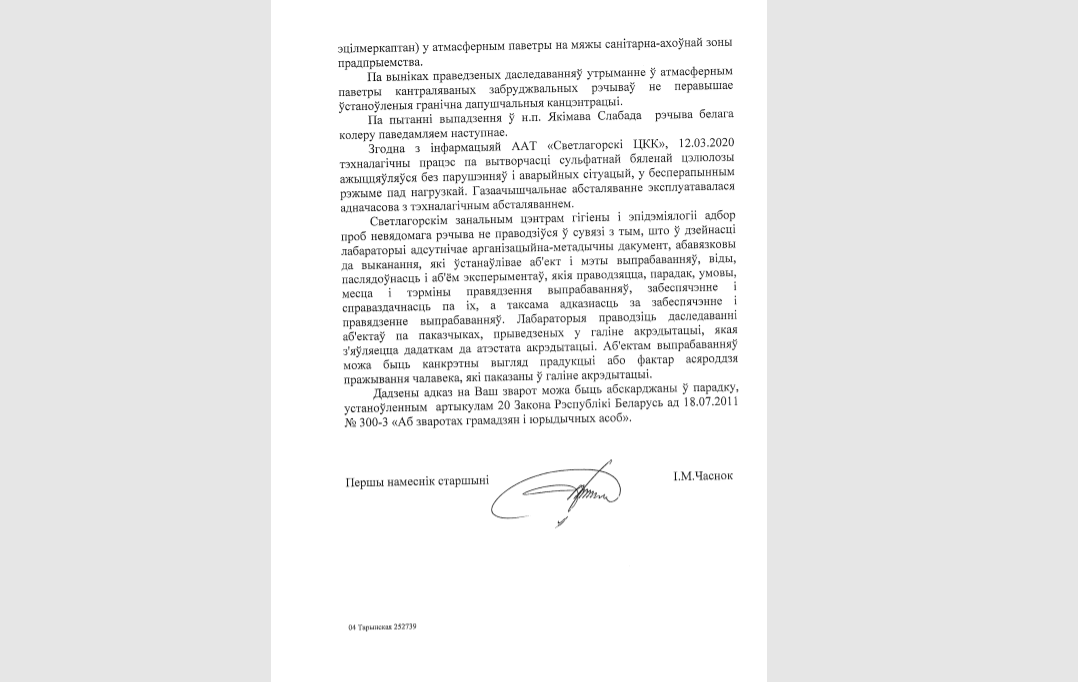 «…адбор проб не праводзіўся ў сувязі з тым, што ў дзейнасці лабараторыі адсутнічае арганізацыйна-метадычны дакумент, абавязковы для выканання, які ўстанаўлівае аб’ект і мэты выпрабаванняў, віды, паслядоўнасць і аб’ём эксперыментаў, якія праводзяцца, умовы, месца і тэрміны правядзення выпрабаванняў, забеспячэнне і справаздачнасць па іх, а таксама адказнасць за забеспячэнне і правядзенне выпрабаванняў», – прызнаецца Часнок у сваім адказе. То бок – хай сыплецца невядома што на галаву жыхароў, разбірацца, што гэта такое не будзем, бо нам ніхто не прыдумаў інструкцыю як гэта рабіць.