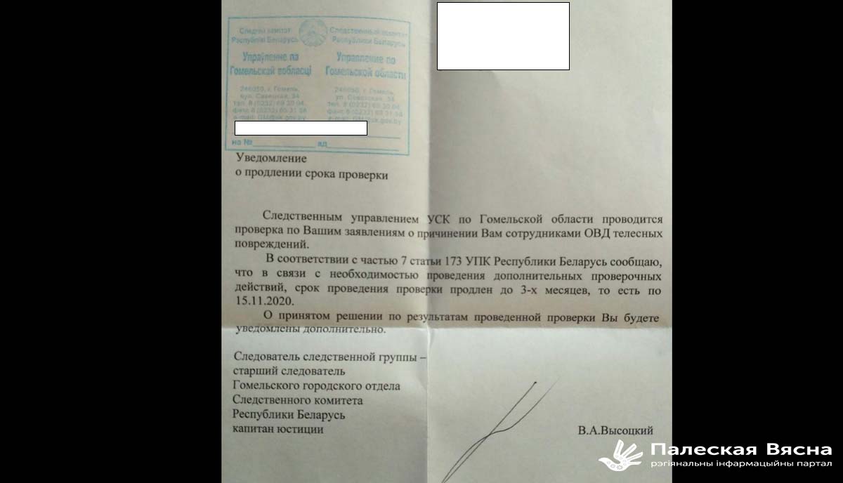 Паведамленні аб чарговым працягу тэрмінаў праверак па заявах аб катаваннях пачалі атрымліваць пацярпелыя, якія падавалі такія заявы пасля вызвалення з Мазырскага РАУС у сярэдзіне жніўня. Раней, пасля таго, які мінулі прадугледжаныя законам першыя 10 дзён на праверку, тэрміны ўжо працягваліся на месяц. Заявы мазырцы падавалі ў Мазырскі раённы аддзел Следчага камітэту. Але ён ужо праз тыдзень перадаў матэрыялы ва Упраўленне Следчага камітэту па Гомельскай вобласці.