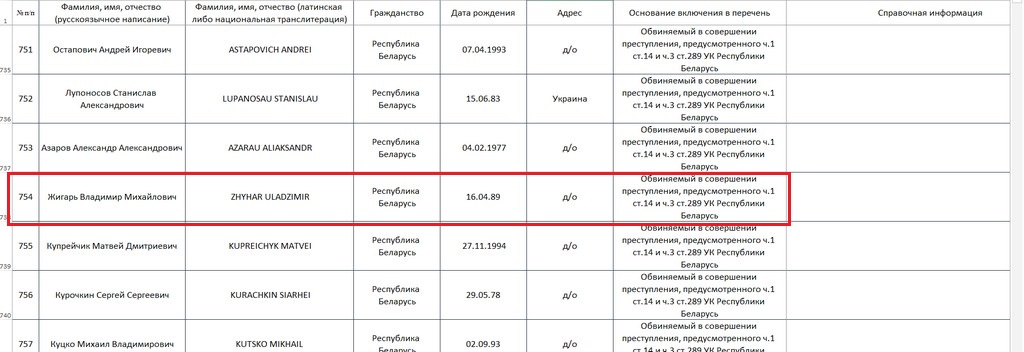 Асноўную масу фігурантаў спісу складаюць дзеячы розных ісламскіх арганізацыяў, якія ўключаныя ў спіс паводле адпаведных рашэнняў Рады бяспекі ААН. І толькі пры канцы спісу станам на 2 красавіка знаходзяцца 17 прозвішчаў, якія ўсе аб’яднаныя тым, што падставай для ўключэння ў спіс стала тое, што яны з’яўляюцца абвінавачанымі паводле часткі 1 артыкула 14 (замах на злачынства) і часткі 3 артыкула 289 (акт тэрарызму, здзейснены арганізаванай групай, альбо з выкарыстаннем радыёактыўных рэчываў, альбо, калі ён выклікаў гібель чалавека). Адкрывае гэтыя 17 прозвішчаў экс-кандыдатка на прэзідэнта Святлана Ціханоўская.