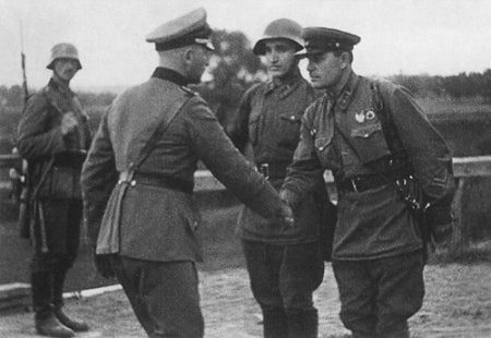 Камуністычныя і нацысцкія вайскоўцы ручкаюцца на сумесным парадзе падчас ІІ Сусветнай вайны