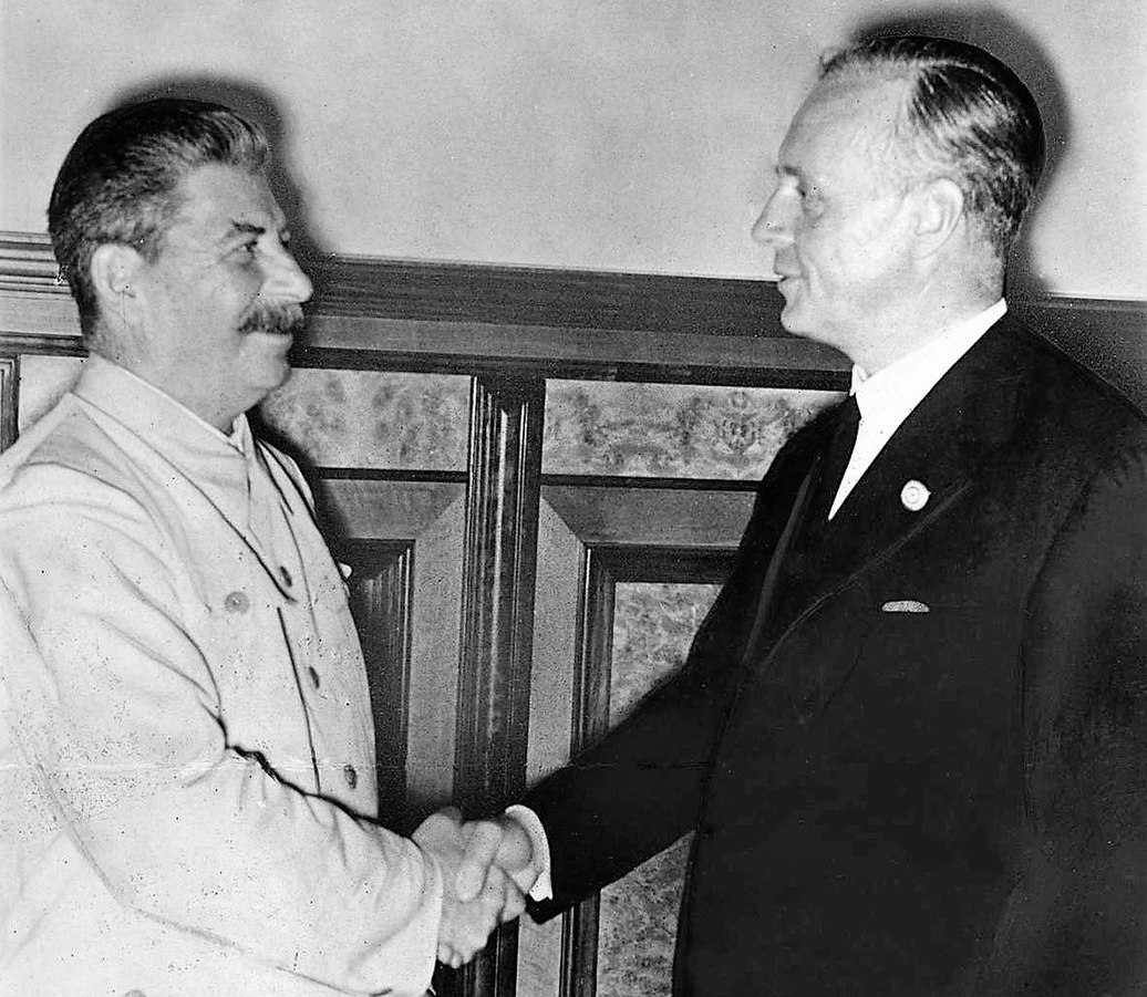 Савецкі дыктатар Іосіф Сталін ручкаецца з нацысцкім міністрам замежных справаў Іахімам фон Рыбентропам. Архіўнае фота.