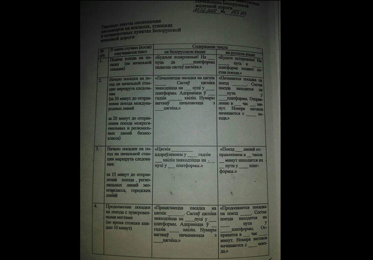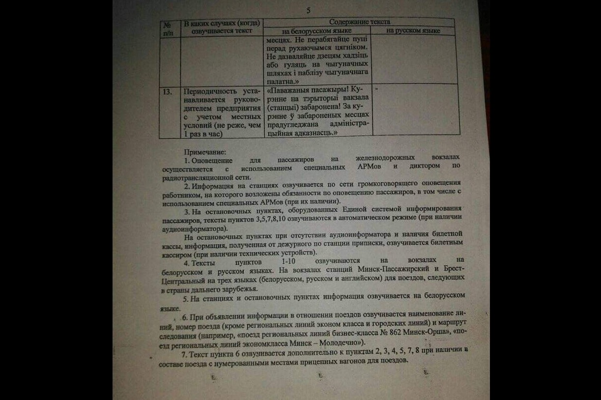 Пры гэтым інфармацыя аб прыбыцці, спазненні і адыходзе цягнікоў, пачатку, працягу і сканчэнні пасадкі, наяўнасці і размяшчэнні прычапных вагонаў, замене рухомага складу, адмене цягнікоў, наяўнасці і месцы знаходжання ў цягніку прычапных вагонаў мусіць абвяшчацца на вакзалах на беларускай і расійскай мовах, а на станцыях і прыпынках – толькі на беларускай. А тэксты абвестак пра бяспеку і забарону курэння на тэрыяторыях станцыяў зацверджаныя толькі ў беларускім варыянце.