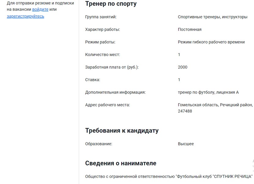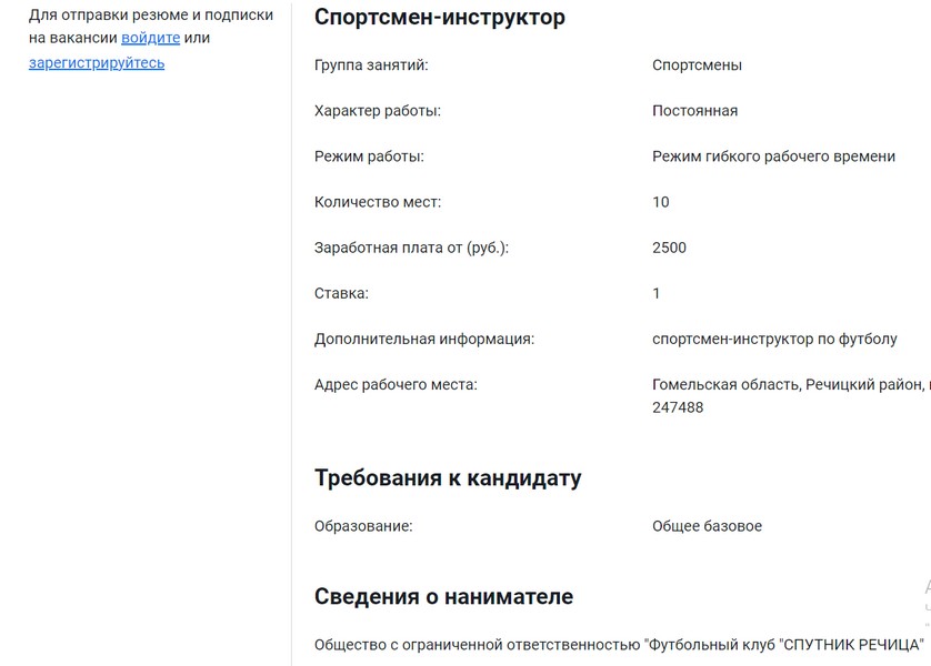 На сайце Дзяржаўнай службы занятасці размешчаная абвестка Таварыства з абмежаванай адказнасцю «Футбольны клуб “Спутник Речица”». У ёй паведамляецца, што клуб мае 10 вакансіяў з назваю «спартовец-інструктар у футболе». Патрабаванні да кандыдата – агульная базавая адукацыя. Заробак, які прапануецца такім работнікам – ад 2500 рублёў.
